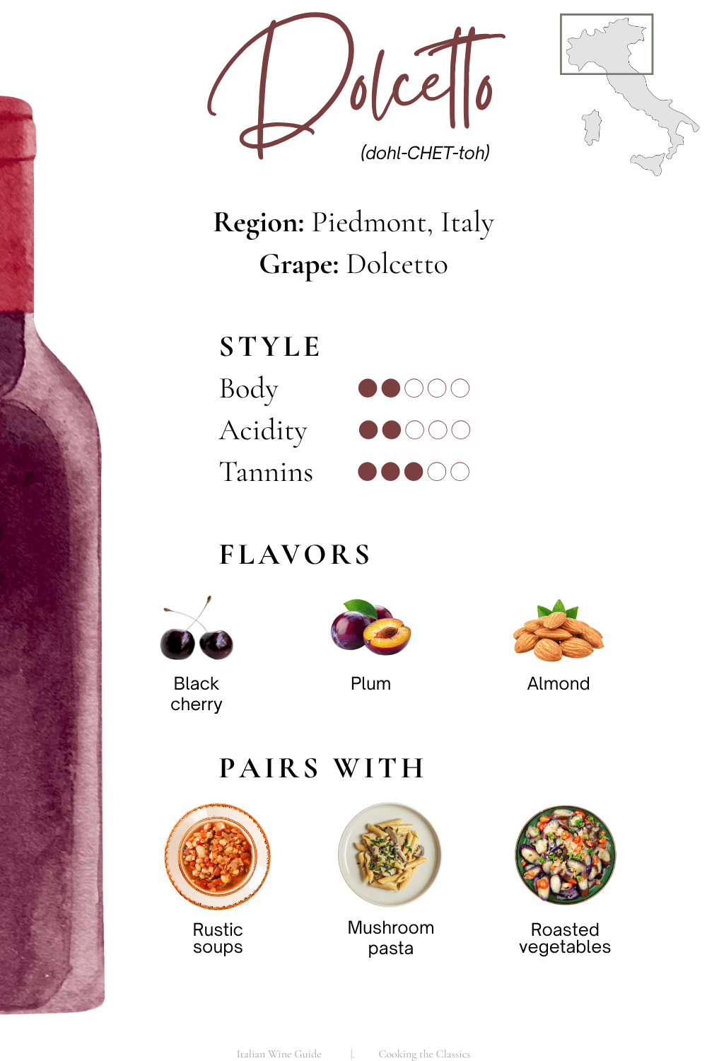 Dolcetto is a red wine from the Piedmont region in northern Italy and is known for its low acidity, soft tannins, and dark fruit flavors. It’s one of the easiest Italian red wines to drink and works especially well with simple, rustic dishes like soups, pasta, and roasted meats.